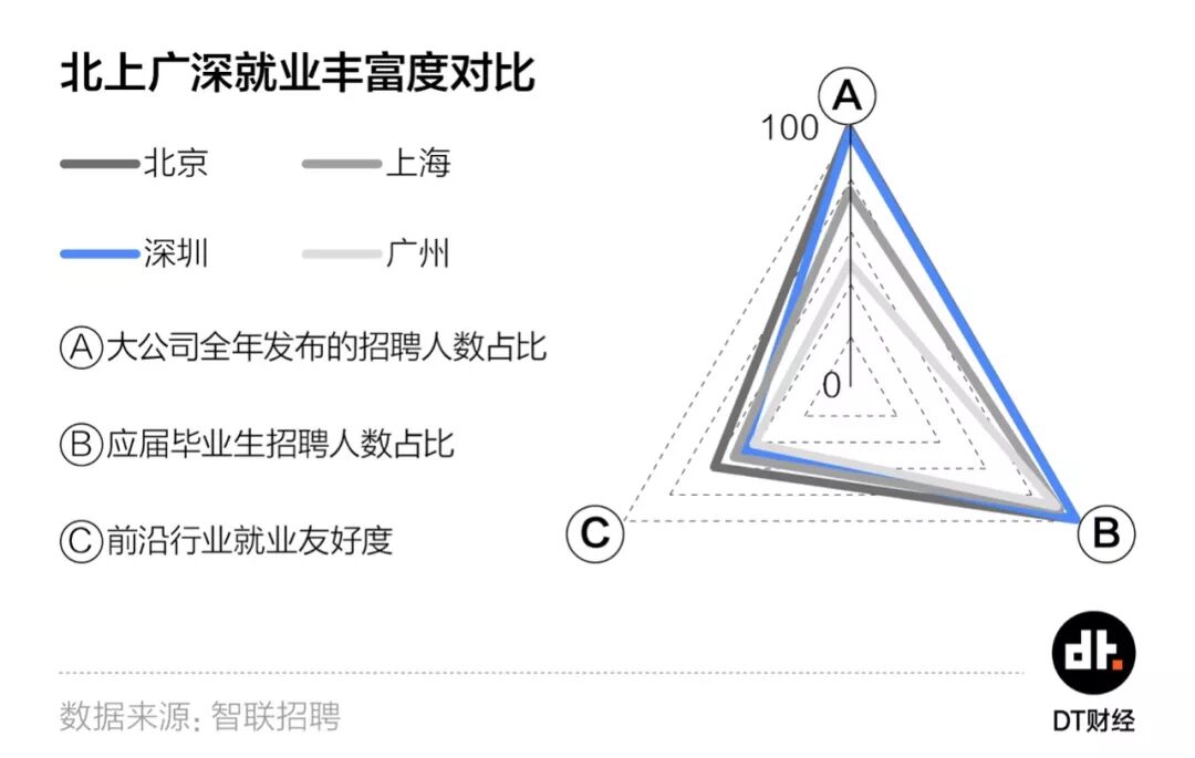 数据显示,2018年,深圳1000人以上大公司提供的岗位数量超过上海和广州,仅次于北京,全市吸纳的应届毕业生数量更是几乎与北京持平——这对于奋进的年轻人来说尤为重要,在DT财经发起的“什么样的城市才能留住年轻人”调研中,“能够提供广阔的发展平台和实现自我价值的工作机会”获得了最多人的投票。