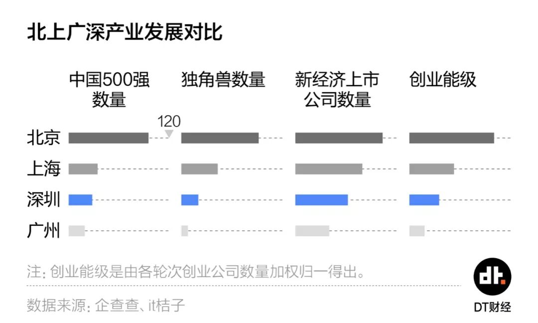 从大的经济数据来看,2018年,深圳的GDP总额超过2.4万亿元人民币,广州将将逼近2.3万亿。从代表经济与产业发展活力的经营主体来看,深圳的500强企业、独角兽、新经济上市公司以及创业公司的数量也全部超过广州,接近上海水平。