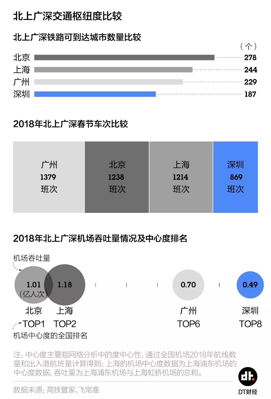 目前,深圳通过铁路与187个城市实现连通,而北、上、广三个城市的连通城市数量分别比它多出了49%、30%和22%。而2018年春节期间,通过深圳的车次数量,仅为广州的63%。