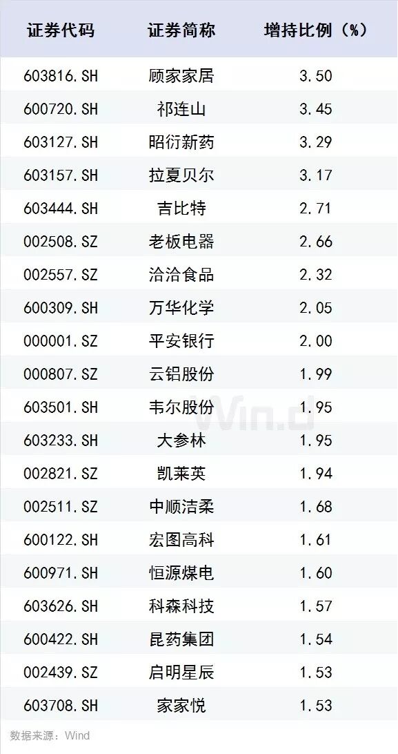 2、从增持比例来看,同期有40只个股增持比例(占流通A股比例,下同)超过1%。其中顾家家居、祁连山、昭衍新药增持比例分别达3.50%、3.45%、3.29%,居于前三位。