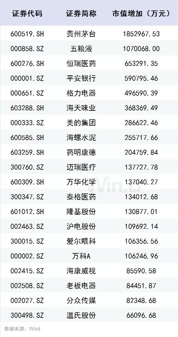 3、从市值变化来看,同期有155只个股持仓市值增幅过亿元。其中贵州茅台、五粮液、恒瑞医药持仓市值分别增加185.30亿元、107.01亿元、65.33亿元,居于前三位。