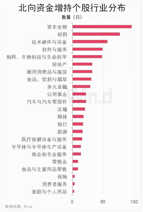 4、从行业分布来看,同期获得北向资金增持个股,主要分布在23个Wind二级行业中。其中资本货物、材料、技术硬件与设备、制药生物、软件服务五个行业个股数量居前,分别达124只、99只、73只、63只、62只。上述5行业总和占总增持个股数量的比例达52.36%。