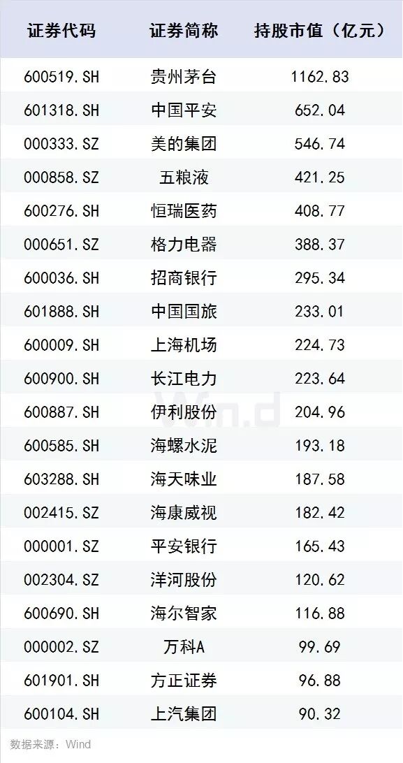 此外,五粮液、恒瑞医药、格力电器、招商银行、中国国旅、上海机场、长江电力、伊利股份同期持仓市值都在200亿元-450亿元之间。