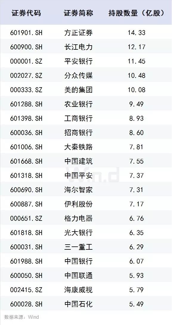 1、从持仓数量来看,目前已有111只个股持仓数量超过1亿股。其中方正证券、长江电力、平安银行持股数量分别达14.33亿股、12.17亿股、11.45亿股,居于前三位置。