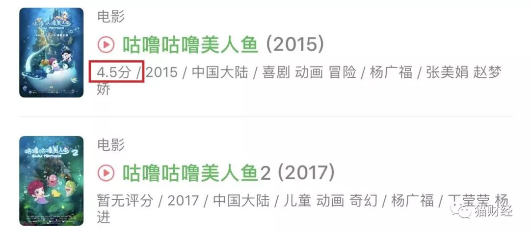 动漫版块,长城动漫的核心IP包括《咕噜咕噜美人鱼》、《小狐仙》、《球嘎子》、《水果三国》、《水果西游》、《天才巫》和《吉米熊之神话图卷》等,不过猫妹发现除了《咕噜咕噜美人鱼》第一部收获4.5的评分外,其余甚至在豆瓣都搜索不到词条。