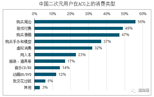 动漫市场的用户一个明显特征就是消费能力强,据智研咨询报告,我国90%以上二次元用户都有消费行为,其中购买周边、游戏付费和购买漫画的人数都在50%左右,目前动漫衍生品也成为动漫市场一大重要的变现方式。