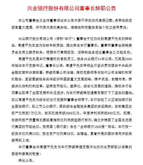 兴业银行9月3日公告称,董事长高建平因为任职年龄原因,提出辞去在该行的一切职务,行长陶以平将在董事长空缺期间临时负责该行全面工作。