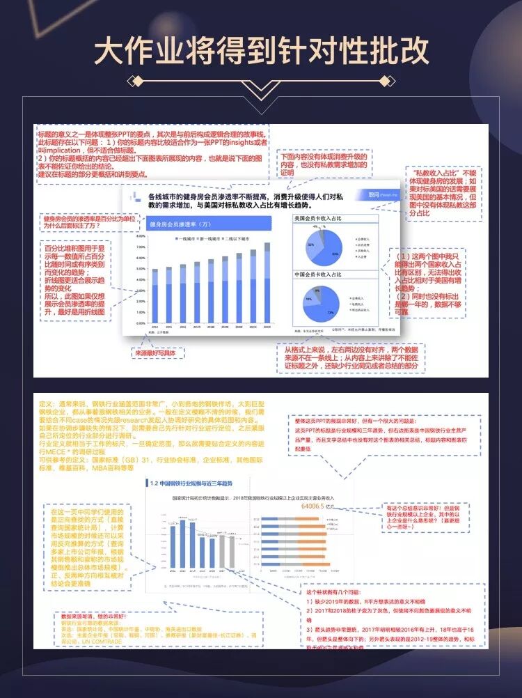比如,如果要做一个健身房行业的投资分析,初阶选手具备一定的信息收集能力,会搜集大量的可靠数据,搭配美观的PPT模版,做出一个看起来还不错的报告: