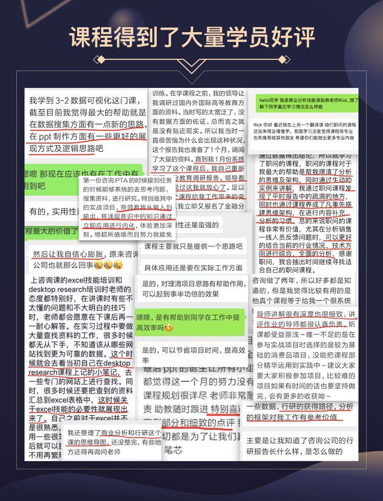 商业分析系列课程向来是职问口碑最好的课程之一。在为期两个月的课程中,我们欣喜地看到,大量同学边学边练,行研、数据分析、PPT制作等能力的提升立竿见影、成果显著,直接帮助提升工作表现: