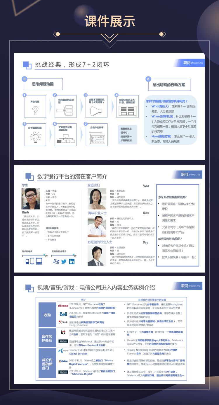 为了帮助大量希望提高商业分析能力、助力职业发展的用户以最快速有效的方法提升,职问今年初推出了【升级版】商业分析技能课。课程受到麦肯锡中国第一人鼎力推荐,第一期课程收获了2000+学员的认可,其中不乏来自四大会计师事务所、华为、IBM等优秀企业的员工。