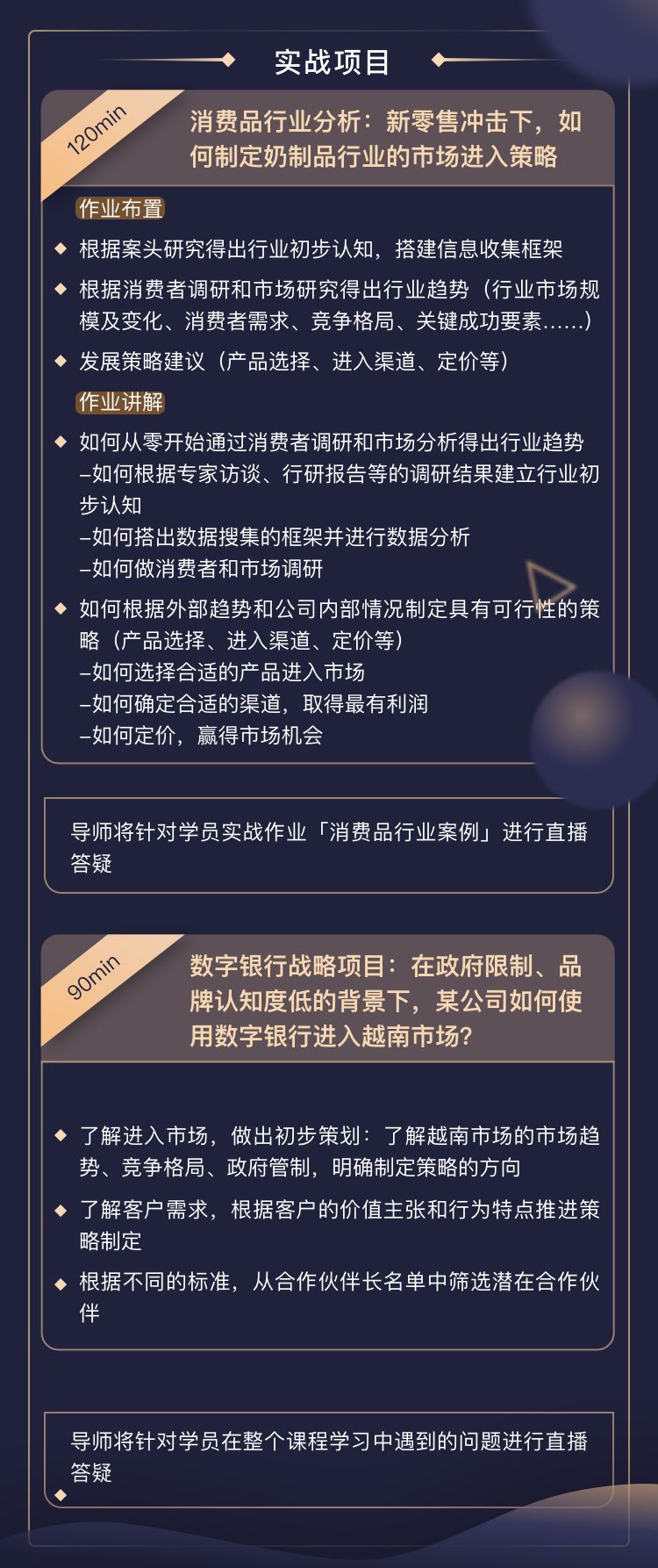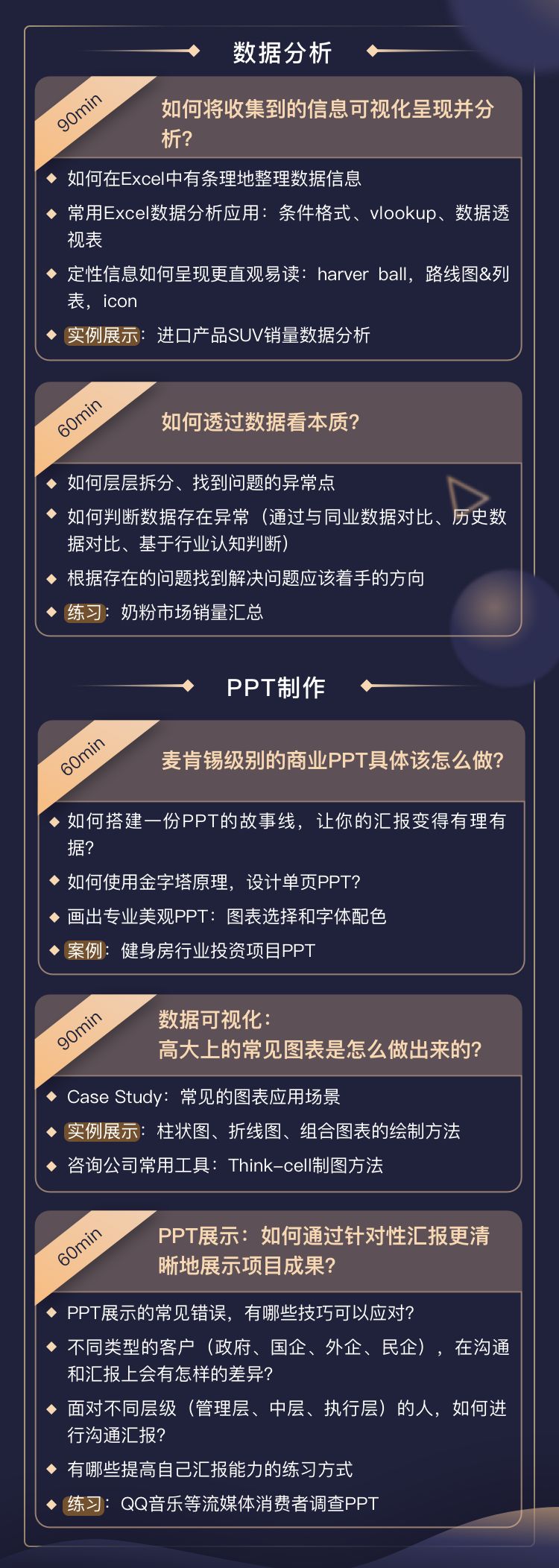 课程设计逻辑是「一个商业问题的界定-分析-汇报」,完整涵盖顶级商业分析师的工作流程,既有数据搜集、行业研究、企业研究、消费者研究,也有Excel数据分析,PPT制作。