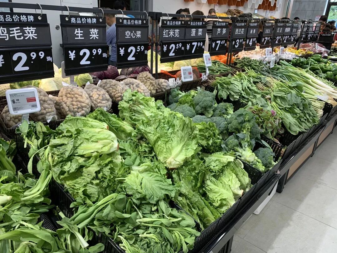 超市中心区域是一个不太“盒马”的摆放散称果蔬的台子。