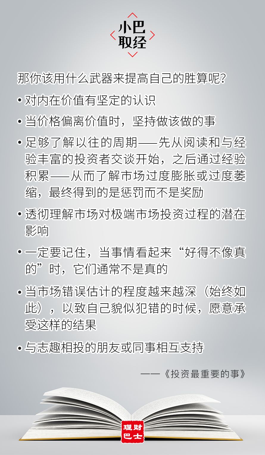 - 小心,这7个投资心理陷阱 - 来自理财巴士 - / 14:20 欢迎回到【小巴取经】,和小巴一起共读经典。 前两周,咱们已经读了霍华·德马克斯《投资最重要的事》前7章,想要回顾的小伙伴,可以点击链