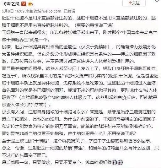 果壳知名科普作者@飞雪之灵不敢苟同发文呐喊:注射胚胎干细胞的所谓“养生”,和当年的打鸡血并没有什么区别。
