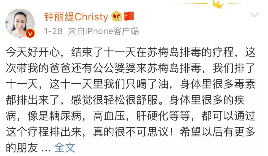 她这样写道:全家人断食11天,期间只喝了油,身体里的很多毒素都排了出来,感觉很轻松很舒服... 身体的很多疾病,像是糖尿病、高血压、肝硬化等,都能通过这个疗程排出来...