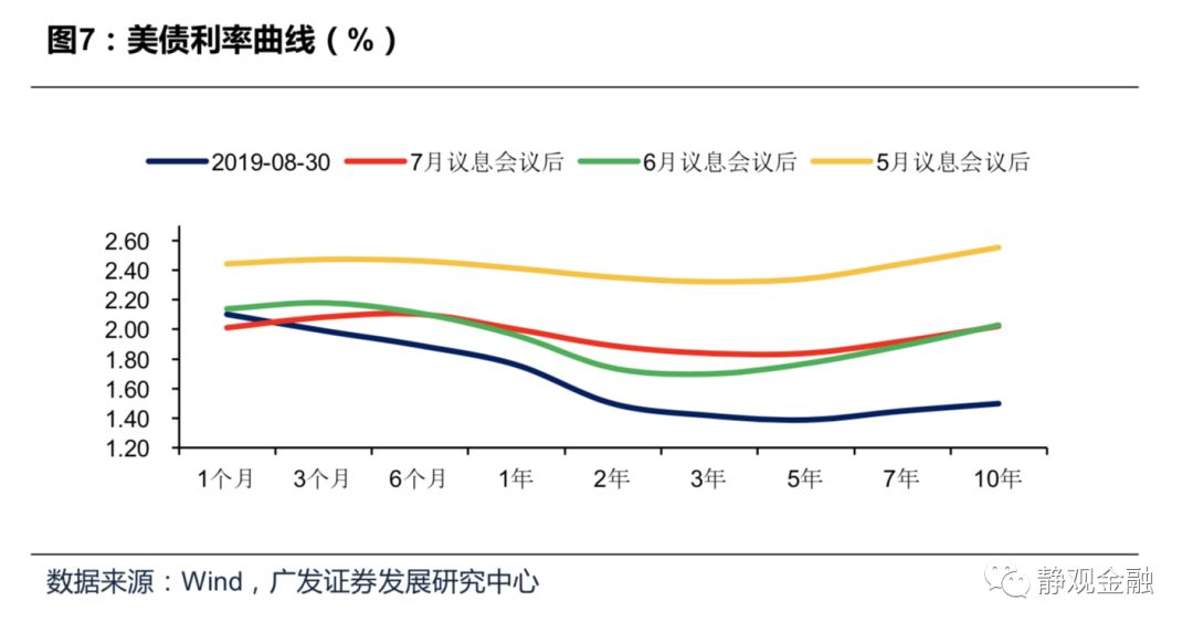 金融危机以来美联储非常注重与市场的沟通。8月ISM制造业PMI数据公布后,芝加哥商品交易所(CME)的数据显示市场预计9月议息会议降息概率为100%,其中降息至1.75-2.00%的概率为92.7%。此外,我们也一直强调,美联储降息的诉求之一是缓解美债收益率曲线倒挂压力。8月以来,10年期与2年期美债收益率也出现倒挂迹象。总而言之,美联储9月议息会议再度降息25BP或已无悬念。