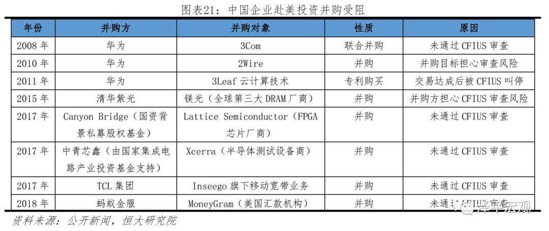 第二,以国家安全风险为由,限制中国企业对美方“敏感领域”尤其是人工智能、半导体、机器人、先进材料等“重大工业技术”领域的投资并购活动。由于美国外国投资委员会(CFIUS)的审查,华为并购3Com和2Wire、清华紫光并购镁光和西部数据均告失败。特朗普上台之后,美国针对中国企业赴美的投资并购活动进一步收紧,2017年中国资本尝试并购美国半导体公司Lattice和Xcerra均未通过CFIUS审查。