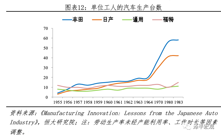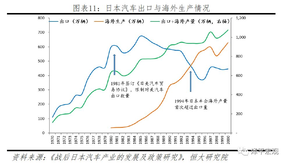 1)加快海外产能投资与布局。1981年5月日美签订了《日美汽车贸易协议》,规定日本从1981年4月至1982年4月,对美国汽车出口限制在168万辆以内。1982年本田最先在美国本土建立日本第一家汽车独资企业,随后1983年日产在美国建厂,1984年丰田和GM合资。由于日本车企的美国工厂约50%汽车零部件都依靠当地供给,同时需要较大规模地雇佣美国工人,因此可以促进美国汽车零部件企业的发展,并降低美国汽车产业的就业压力,这在一定程度上缓解了美日汽车贸易摩擦。