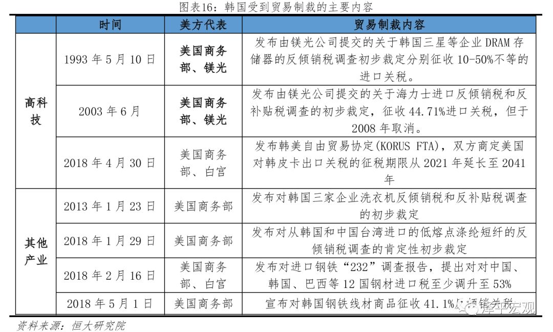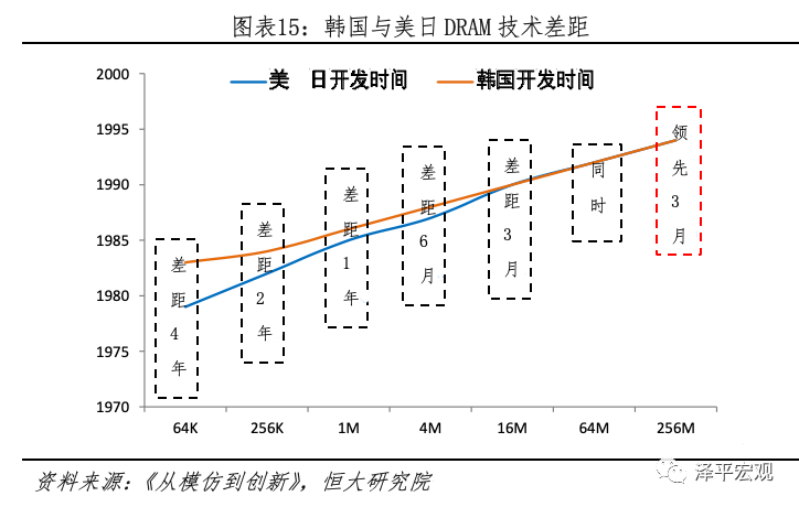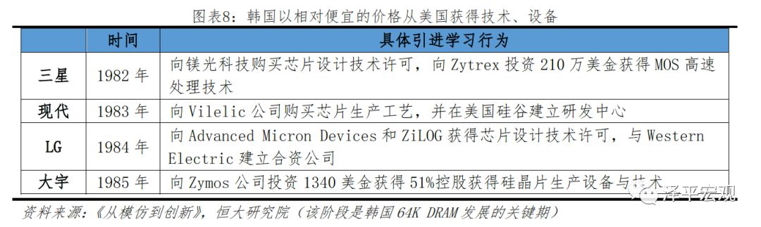 三、美韩科技战:韩国不同于日本和苏联,由于市场较小、高科技领域较为集中,韩国并未对美国造成全面威胁,因此美韩科技战以个别领域的贸易摩擦和个别公司的专利纠纷为主,韩国基本没有受到美国政府大力度的打压。韩国更多被美国以反倾销和反补贴的名义在钢铁、家电、化工原材料等领域起诉。在高科技领域,韩国则通过错位竞争、转移出口市场、财阀与美方互换技术、共同研究等手段化解纠纷。在美日经济争霸期间,韩国抓住产业变动产生的需求变化机会,财阀持续主导对设备、材料、人才进行“逆周期”投资。通过初期向美国购买技术、设备,建立海外实验室学习和模仿,后期在政府牵头下进行联合研究攻关,韩国企业的DRAM技术大幅提升,成功跨入半导体强国之列。