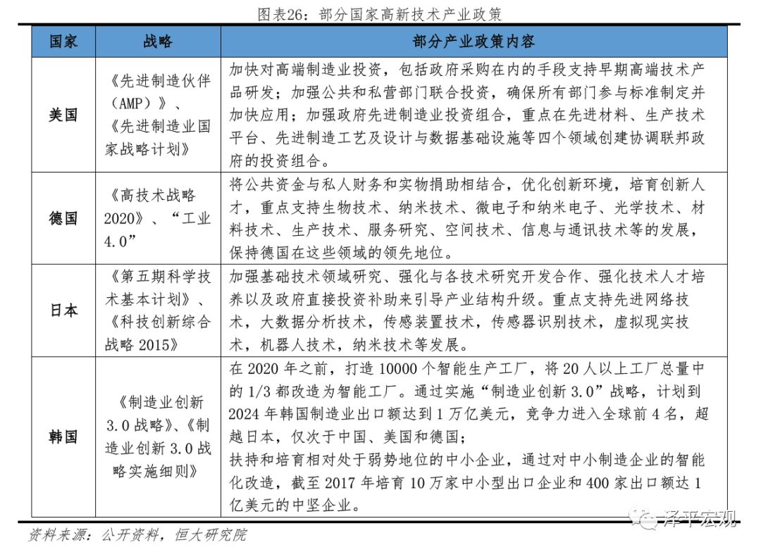 事实上,理论与历史经验均表明产业政策一直在经济发展和产业结构升级过程中发挥着重要的作用,包括美国在内的各主要经济体近年来均在高科技领域制定相似产业政策,美方在产业政策问题上采用双重标准实质是为了遏制中国的产业升级。在市场经济运行过程中,由于资本的顺周期逐利性与历史局限性,从长期来看难以仅凭市场力量促进产业的升级与技术的进步。以国家主导的产业政策扮演着积极引导与调整产业结构的角色,能起到提升社会资源配置效率,加快产业、技术、人才向更优结构转变等重要作用。进入21世纪以来,伴随经济水平的不断提高以及计算机技术的进步,以大数据、云计算为依托的各类高端制造、智能科技产业逐步兴起,美德日韩等国为在新一轮工业革命中抢占先机,均纷纷出台相关产业政策鼓励、引导企业在高科技领域的投资。从发布的高科技制造业战略以及政策来看,各国指导性纲领中提及的战略目标以及实施方式相似度很高。2012年美国提出《先进制造业国家战略计划》,强调加快对中小企业高端制造业投资,并通过政府采购以及直接投资、支持基础技术研发、提高政产学研用模式效率、培育高科技术人才等手段支持高端制造业的发展。该计划内容与《中国制造2025》、韩国《制造业创新3.0战略》、日本《第五期科学技术基本计划》以及德国《高技术战略2020》主体内容以及实现的方法手段极为相似。
