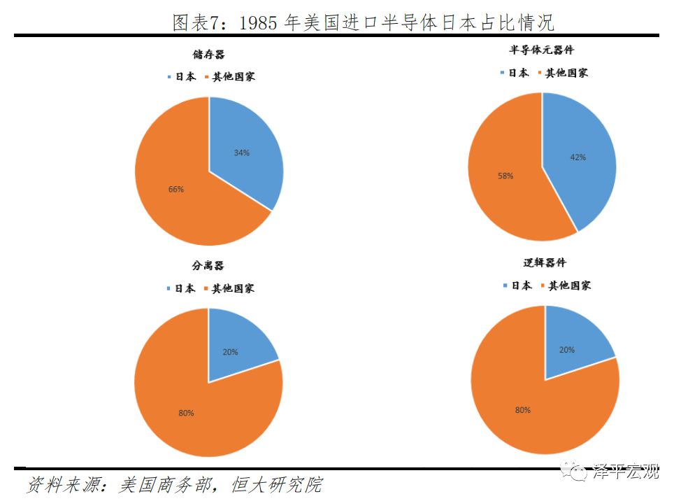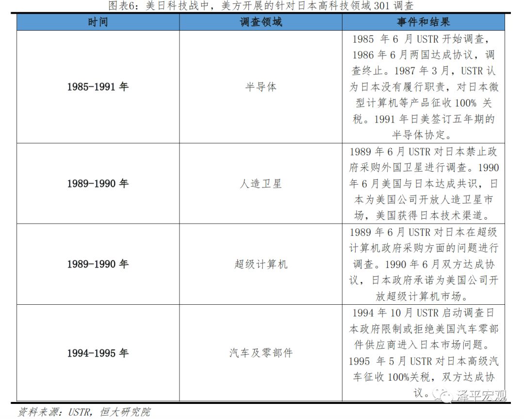 二、美日科技战:从1950年代中期到1990年代初的三十多年,日美经济争霸从轻工业等中低端制造业的贸易摩擦逐渐升级为汇率金融战和以半导体为代表的科技战。面对美国步步紧逼,日本政府应对失当,实行过度宽松的货币政策和财政政策,大量资金从制造业流入股市、房市,而在紧急加息抑制地价房价后,日本经济泡沫破裂、发展高科技乏力,陷入“失去的二十年”。美日科技战具有三个特点:1、持续时间长、涉及面广。美日科技战持续三十多年、涉及六大产业。1986年日本企业占全球DRAM市场的份额达到80%,超过美国成为世界半导体第一强国,日本是20世纪全球为数不多的对美国科技领先地位产生威胁的国家。2、涉及领域从低端制造业向高科技行业升级。美日科技战首先在20世纪60年代的纺织品等轻工业爆发,后逐步升级至家电、汽车等高端制造业。1983年,美国半导体协会联合美国国防部在《政府对世界半导体竞争的影响》报告中提到,“半导体是美国维持科技垄断地位的重中之重………日本政府通过倾销和市场限制两种手段违反公平贸易,并以此把日本企业推向全球领导地位”,最终半导体产业成为美日科技战的主战场。3、充分施加政治军事外交影响,工具手段丰富。美日科技战以对特定企业的制裁为突破口,以此作为极限施压的筹码要挟日本签订双边协议、强迫日本打开国内市场、扩大进口并削弱日本的产业政策,同时积极扶持日本竞争对手,瓦解日本的科技产业优势。