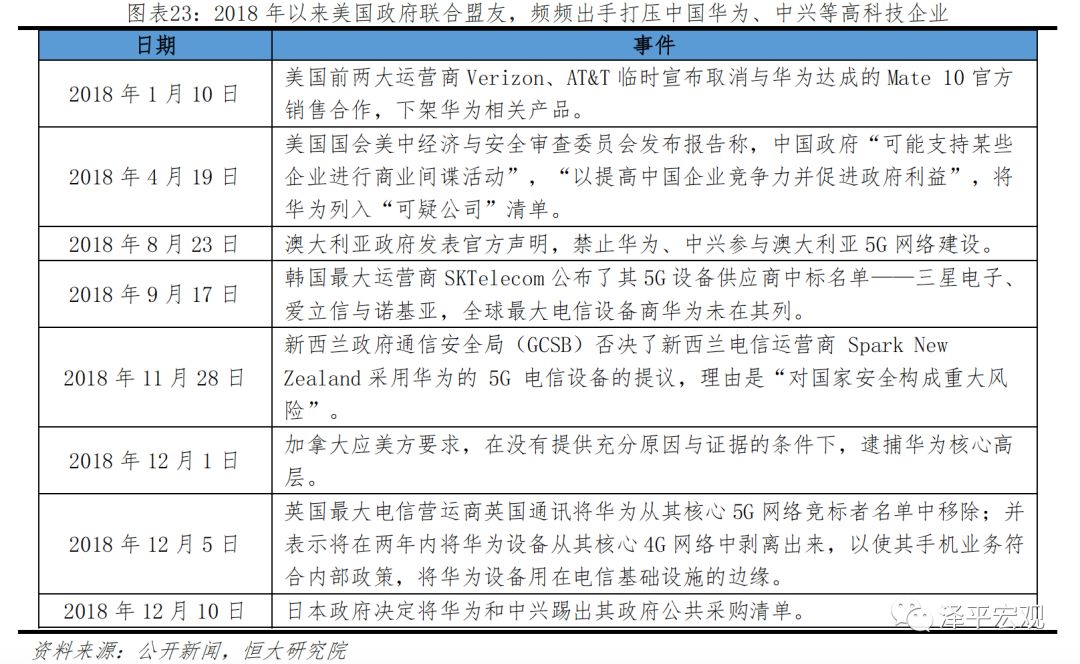 第三, 美国以国家安全名义,联合盟友遏制中国高科技企业在美、日、英、澳和新西兰等的市场扩张。2018年以来美国多次以国家安全为借口,频频出手遏制华为等中国企业的发展,例如1月阻碍华为与美国前两大运营商Verizon和AT&T;合作,禁止美国运营商销售华为手机;施压其贸易伙伴国,使得8月起澳大利亚、新西兰、英国、日本等国纷纷将华为、中兴等企业排除出政府采购清单和5G网络建设与服务招标名单。