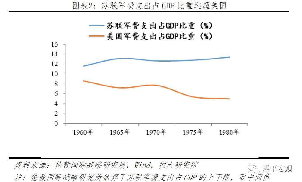 2)苏联军费支出占GDP比重过高,挤出民用工业投资。根据伦敦国际战略研究所估算数据,1960-1980年苏联军费支出占GDP比重始终在10-15%区间内,而美国军费支出占GDP比重从1960年的11.6%下滑至1980年的5%。庞大的军费支出挤出了民用工业的固定资产投资和资本形成总额,一方面抑制了长期经济增长,另一方面民用产品供给不足也给苏联解体前的通胀埋下伏笔。
