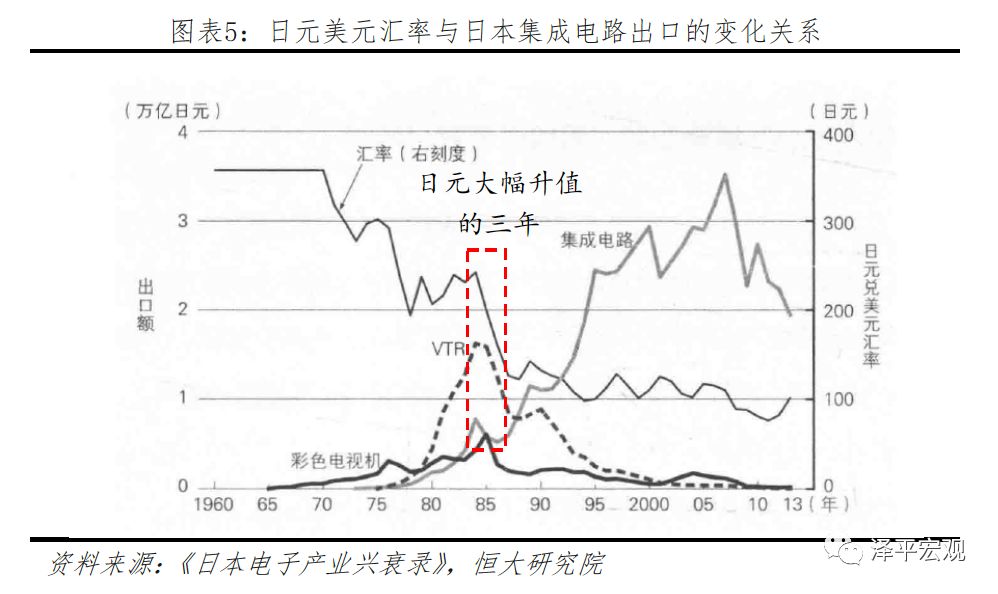 美国通过政治施压推高日元汇率,短时间大大挫伤日本高科技产业出口优势,降低其海外市场份额。1985年美日签订《广场协议》后,仅3年时间,日元美元汇率从240:1提升为120:1,期间严重打击日本“物美价廉”的出口优势,同期的日本集成电路出口额大幅降低。
