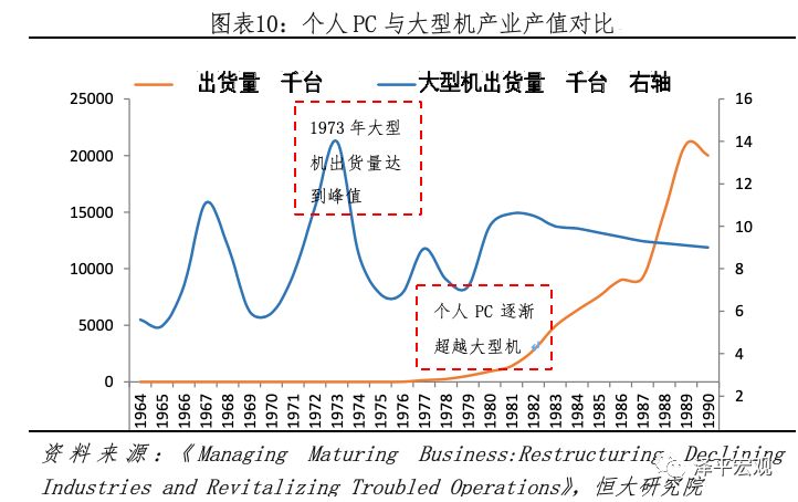 2)对产业趋势严重战略误判。日本半导体企业沉浸于大型机时代的成功,忽略了个人电脑市场兴起对新一代微处理器和存储器技术带来的新需求。在大型机时代日本半导体企业取得了巨大成功,但是1973年全球大型机出货量已到顶峰,1980年后大型机领域霸主IBM推出个人计算机,计算机产业开始由大型机时代进入个人计算机PC时代。一方面微处理器的重要性显著提升,另一方面由于消费电子的产品更新周期明显缩短,市场对DRAM(动态随机存取存储器)芯片的需求从可靠性和稳定性转变为灵活性和低成本。日本半导体产业的停滞不前给竞争对手创造了巨大的机遇。其中,1995年前后韩国的DRAM技术反超日本;英特尔专注于半导体的另一细分市场——微处理器业务,到1995年已经超过NEC(日本电气)成为全球最大的半导体公司。