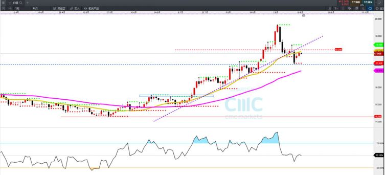 白银(Sliver)周一(9月16日)借“沙特遇袭”事件,高开收阳,连续2个交易日上涨。技术上对于上周五(9月13日)近光脚中阴线呈现内孕线组合结构,日线RSI位于50%水平附近,回调水平确认,有望再度上试18.206—18.49美元水平区域。