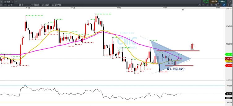 黄金以9月12日19点至今,结构演化成一个三角形结构,周一缺口虽有回补,然交投区间已经形成,维持1494—1508美元水平的主要交投区域。