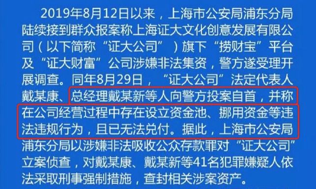 9月1日,上海市公安局浦东分局微博发布通报,因涉及非法集资案,“证大公司”法定代表人戴某康,已向警方投案自首。通报显示相关公司经营过程中存在设立资金池、挪用资金等违法违规行为,已无法兑付。