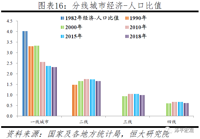 总的来看,1990-2018年,一线城市人口占比从2.8%增至2018年的5.3%,二线城市人口占比从16.1%增至20.5%,三四线城市人口占比从81%降至74.2%。在人口向一二线集聚的背后,是经济的集聚。该时期,一线城市GDP占比从9.4%增至12.2%,二线城市GDP占比从23.8%增至33.7%,三四线城市GDP占比从66.8%降至54.1%。2018年,一线、二线、三线、四线城市经济-人口比值分别为2.3、1.6、1.0、0.6,这预示着四线城市人口将继续大幅流出,一二线城市人口将继续集聚。