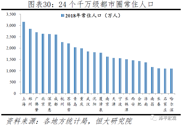 从城市和都市圈来看,以常住人口论,2030年中国有望形成10个以上1000万级城市和12个以上2000万级大都市圈。未来向19个城市群集聚的人口以及19个城市群内部流动的人口,将主要集聚到千万级以上的大都市圈。2019年2月,国家发展改革委发布《关于培育发展现代化都市圈的指导意见》,要求以都市圈为城市群建设的突破口、以同城化为都市圈发展方向,这是中央第一份以都市圈为主题的文件。