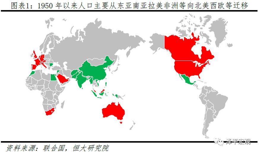 全球人口迁移呈现两大特点:一是在跨国层面,人口从中等、低收入国家向高收入国家迁移。根据联合国《世界人口展望(2019年修订版)》统计,1960-2017年,高收入经济体人口净流入规模累计达1.36亿,其中来自中高收入、中低收入、低收入经济体的比例分别为26.4%、53.2%、20.5%。中高收入经济体人口生活水平接近高收入经济体,迁移动力不强;低收入经济体人口虽然迁移动力强,但难以承担迁移成本;而中低收入经济体人口迁移动力强,且能够承担迁移成本。从国别看,主要是人口从中国、东南亚(菲律宾、缅甸、印尼、越南等)、南亚(孟加拉国、印度、巴基斯坦等)、拉美(墨西哥等)、非洲、中东动乱国家(叙利亚等)、中东欧向北美、西欧、中东石油富国(阿联酋、沙特阿拉伯)、俄罗斯、澳大利亚等迁移。其中,1960-2017年美国净迁入人口超过4900万,德法英西意等西欧五国净迁入合计超过3300万,沙特阿拉伯和阿联酋净迁入合计超1400万,俄罗斯净迁入近1100万,加拿大净迁入超900万,澳大利亚净迁入近700万。日本移民政策长期较为保守,净迁入人口较少、仅235万。