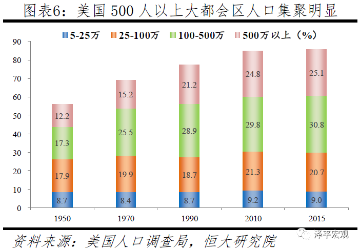 二是在城乡层面,美国人口在城市化中后期明显向大都会区集聚。美国城乡划分标准多次调整,当前城市的基本定义为:50000人以上的城市化区域(Urbanization Areas,UAs),和2500-50000人的城市簇(Urban Clusters,UCs)。美国城市化率在1910年达45.6%,1940年达56.5%、与中国当前接近,1970年达73.6%,2010年达80.7%。同时,基于经济社会高度联系的城市功能联系思想,美国人口调查局于1910年开始逐渐形成都会区统计(Metropolitan StatisticalAreas,最小规模为5万人以上)。1910-2015年,美国都会区人口比重从28.4%增至85.6%,其中人口向大都会区化集聚态势明显。1950-2015年,5-25万人的都会区人口比重增加0.3个百分点,25-100万人的都会区人口比重增加2.8个百分点,而100-500万人、500万人以上的都会区人口比重分别增加13.5、12.9个百分点。特别是在1970-2015年,500万人以上都会区人口比重增加9.9个百分点,远高于100-500万、25-100万、5-25万人都会区的5.3、0.8、0.6个百分点。2015年,美国5-25万、25-100万、100-500万、500万人以上都会区经济-人口比值分别为0.75、0.84、1.09、1.26,高收入的大都会区依然对人口有着较大吸引力。