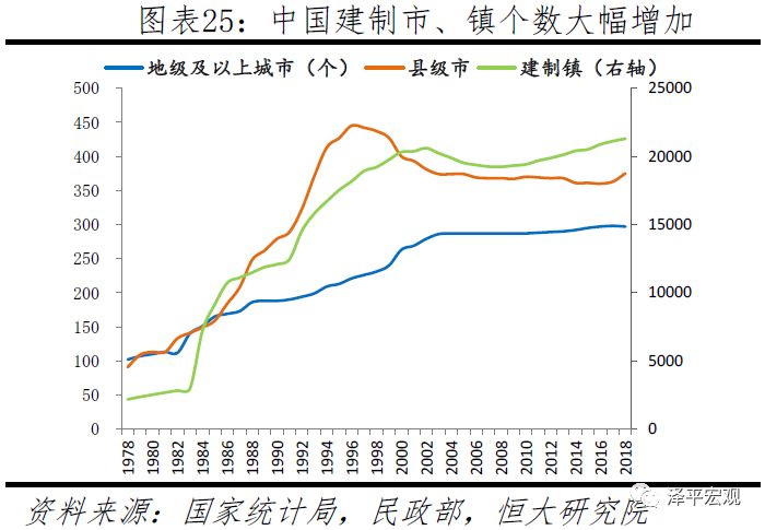 从中国城市化历程看,城镇人口增长来自三个部分:自然增长、乡城迁移和行政区划变动。行政区划变动引致的城镇化可简单理解为就地城镇化,包括县改市(区)、乡改镇、村改居,以及其他城镇空间范围扩大。1978-2018年,中国城市数量从193个增加到672个,建制镇数量从2173个增加到21297个;其中,地级以上城市从102个增至297个,市辖区从408个增至970个,县级市从91个增至375个。