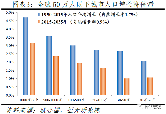 二是在城乡层面,随着全球城市化进程进入中后期,不同规模城市人口增长将从过去的齐增变为分化,人口从乡村和中小城市向一二线大都市圈迁移,而中小城市人口增长面临停滞、甚至净迁出。1950-2015年,全球城市化率从29.6%增至53.9%,该时期所有规模城市的人口占比均有明显上升,所有规模城市人口年均增速均明显超过1.7%的自然增长水平。其中,1000万人以上城市人口占全球总人口比重从0.9%增至6.3%,30万人以下小城市人口占比从17.8%升至22.9%,分别上升5.3、5.2个百分点。根据联合国预测,到2035年全球城市化率将达62.5%,大城市和大都市圈人口继续快速积聚,但50万人以下城市人口年均增速将降至1%、略高于0.9%的自然增长水平。