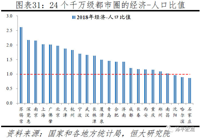 从都市圈常住人口看,中国现有上海、北京、广佛肇、深莞惠、郑州、成都、杭州、苏锡常、青岛等9个2000万人以上的大都市圈,有重庆、武汉、沈阳、厦漳泉、南京、天津、宁波、长株潭、西安、合肥、济南、南昌、长春、石家庄、哈尔滨等15个1000万-2000万人大都市圈。其中,重庆都市圈人口接近2000万,武汉都市圈也超过1800万,南京都市圈仅宁镇扬三市人口1615万、若加上毗邻的皖东城市则远超2000万,从这三个都市圈的人口增长潜力和空间扩展潜力来看,预计未来人口有望突破2000万。2018年,上述24个大都市圈土地面积60万平方公里,占全国的6.2%;常住人口4.5亿,占比32.5%;GDP合计47万亿元,占比52.2%;经济-人口比值为1.6。需要说明的是,部分都市圈范围存在不同版本,考虑到都市圈强调同城化发展,此处测算人口经济数据均采用范围最小的版本,武汉、济南都市圈范围均比2018年报告中要小;上海都市圈与周边的苏锡常、宁波、杭州都市圈范围有重叠。