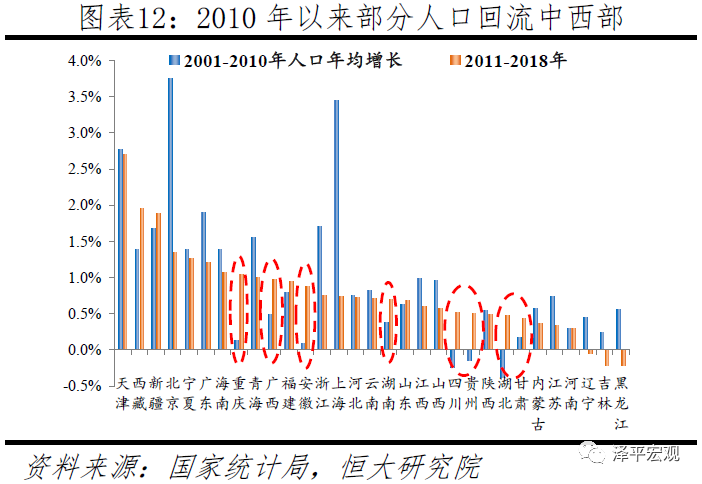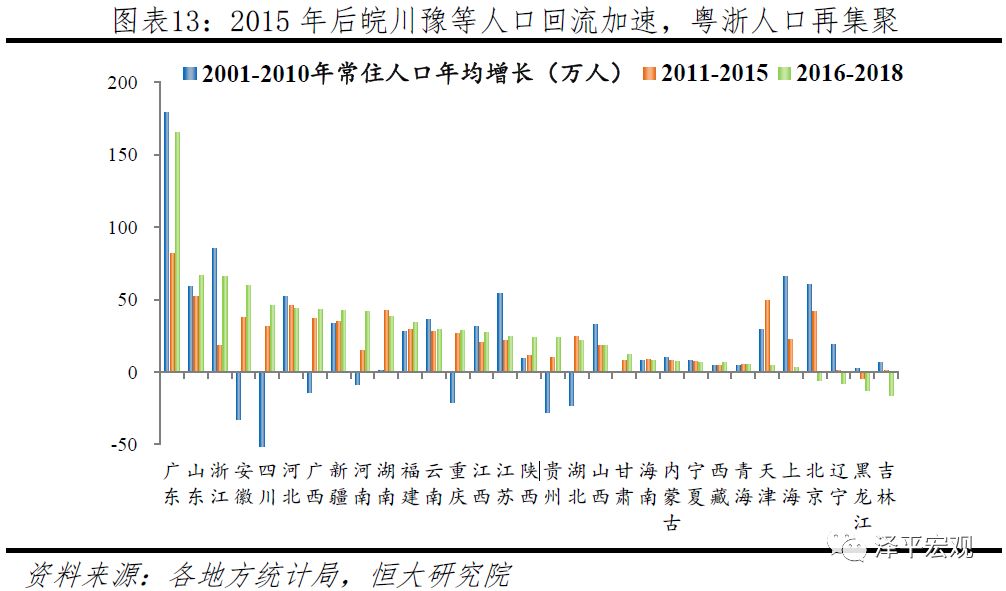 3、2010年以来,随着沿海地区产业转型升级、中西部地区产业承接以及老一代农民工老化,部分人口逐渐回流中西部,东北地区人口开始负增长。在这一趋势下,我们看到,一方面,珠三角、长三角、京津2018年的经济份额为36.4%、较2010年下滑1.3个百分点;2018年人口占比为22.4%,仅提高0.4个百分点,表明人口仍在集聚但已放缓。其中,长三角人口占比下滑0.1个百分点。另一方面,中西部农民工输出大省常住人口增长明显加快,四川、湖北、贵州等之前人口一度负增长的地区逐渐重回正增长。而东北地区衰落趋势未得扭转,经济份额降至6.3%、较1978年下滑6.9个百分点,黑龙江、辽宁、吉林人口先后从2014、2015、2016年开始陷入负增长。