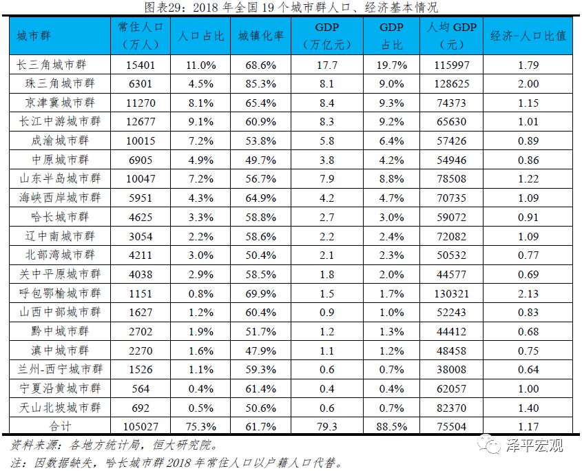简单测算,先不考虑区外人口迁入,依据各城市群当前城市化率适当调整到2030年提高幅度,并结合联合国预计的自然增长率,估计19个城市群到2030年城镇人口增量合计1.3亿。假设根据再有约3000万人口净流入,则2019-2030年城镇人口增量比例可达约80%。基于发展趋势、经济-人口比值、近期人口净流入以及区位等因素,在大致假设区外人口迁入分布的情况下,2019-2030年长三角、珠三角、京津冀、长江中游、成渝、中原、山东半岛等七大城市群城镇人口增量占比有望达约60%。到2030年,19大城市群常住人口合计占比或将从2018年的75.3%上升至76.6%左右。