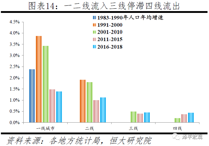1、在全域层面,一线、二线城市人口持续流入,三线城市人口略微流出,四线城市人口显著持续流出但近年有所回流。1982-2018年,一线、二线城市人口年均增速均显著高于全国平均水平,且一线城市增速更高,表明人口长期净流入、且向一线城市集聚更多。其中,1991-2000年、2001-2010年、2011-2015年、2016-2018年,一线城市人口年均增速分别为3.9%、3.4%、1.5%、1.4%,二线城市分别为1.9%、1.8%、1.0%、1.1%,表明2011年以来一二线城市人口流入放缓但仍保持集聚,放缓的原因包括京沪控人、人口老化农民工回流等。近年二线城市人口增速略微上升与“抢人”政策有关。上述四个时期,三四线合计人口年均增速分别为0.63%、0.37%、0.30%、0.27%,而全国人口平均增速为1.04%、0.57%、0.50%、0.50%,表明三四线人口处于持续净流出。其中,2001-2010年、2011-2015年、2016-2018年三线城市人口年均增速分别为0.49%、0.40%、0.44%,略低于于全国0.57%、0.50%、0.50%的人口增速;四线城市人口年均增速均为0.18%、0.37%、0.43%,显著持续低于全国平均水平但2010年后有所回流。由于统计上各地区人口加总不等于全国,三四线合计人口为全国剔除一二线得到,与三线、四线人口不完全吻合。