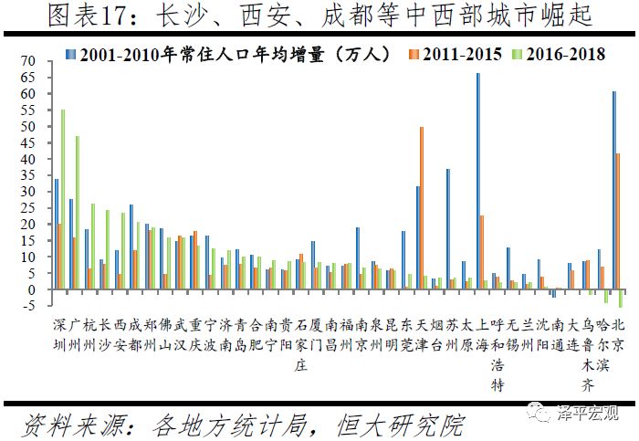 从重点城市看,近年深圳、广州、杭州常住人口大幅增长,长沙、西安、成都、郑州、武汉、重庆等中西部核心城市日益崛起,北京、上海、天津、苏州、无锡等东部城市人口增长明显放缓。过去二十年,中国城市的人口集聚格局发生深刻变化。除京沪从2013年开始主动控人外,其他城市近期多在“抢人”、但成效各异。2001-2010年,常住人口年均增量最大的前五个城市为上海、北京、苏州、深圳、天津,分别年均增加66、61、37、34、31万。2011-2015年,常住人口年均增量最大的前五个城市为天津、北京、上海、深圳、郑州,分别年均增加50、42、22、20、18万。2016-2018年,常住人口年均增量最大的前五个城市为深圳、广州、杭州、长沙、西安,分别年均增加55、47、26、24、23万;成都、郑州、佛山、武汉常住人口年均增加也超过15万,而传统的人口集聚大市北京、上海、天津、苏州、无锡、东莞年均增加不足5万,北京2017-2018年持续两年负增长、天津2017年一度负增长。