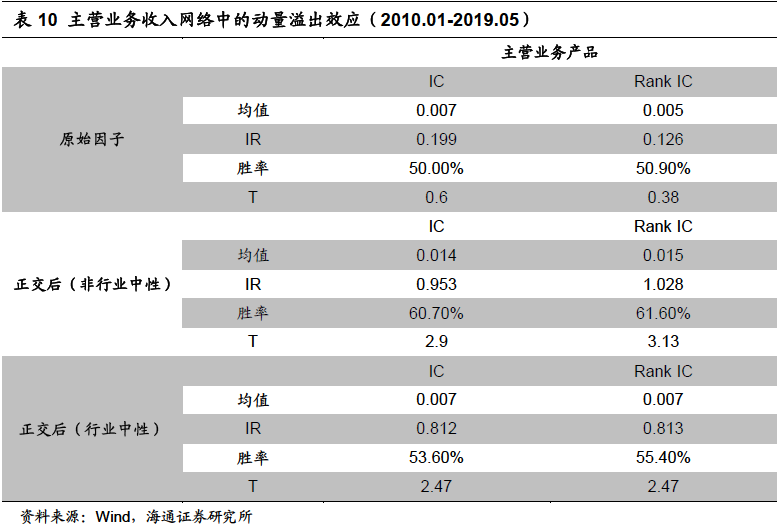 在主营业务收入网络中,存在微弱的动量溢出效应。即,有相同主营产品的公司,股价的变化会有同向的传导现象。但是这种溢出效应,仅存在于非行业中性下的正交因子中。此时,因子的IC和Rank IC分别为0.014和0.015,对应的IR分别为0.953和1.028,胜率高于60%,T值在3左右。然而,进一步对因子做行业中性化处理后,IC和Rank IC大幅下降至0.007。这一结果也很容易解释,因为同一行业中的公司更容易有相同的主营产品,使得主营业务收入网络接近于另一种形式的行业分类。