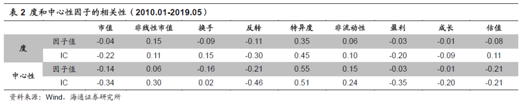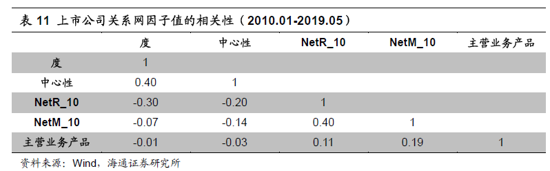 2.3关系网因子的相关性本文分别基于股价相关性和主营业务产品建立网络,得到了度、中心性和溢出效应三类因子。着重考察了它们和股票预期收益的关系,并分析了各自与常用因子之间的相关性。本节进一步考察这些关系网因子内部的相关程度,结果如下表所示。