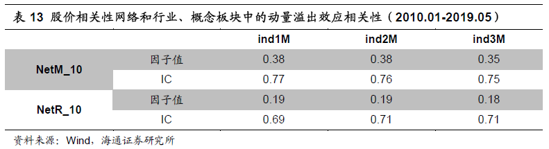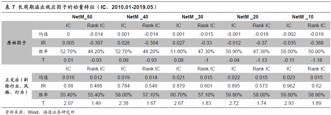 下表详细展示了因子的IC等特征。其中,“NetM_50”表示和每个股票相关系数绝对值最大的50%股票,过去20日的平均涨幅,以此类推。