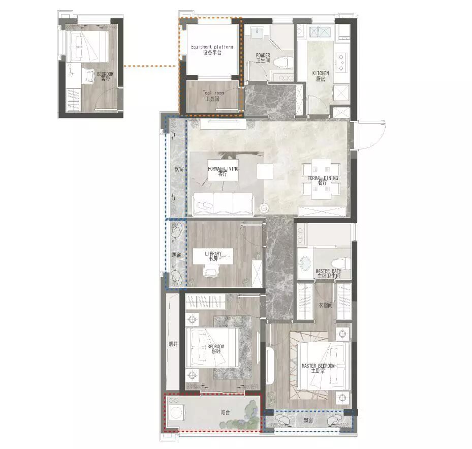 在许多新房已经把120㎡配置为三房的当今楼市,这样逐层进阶,却又严格控制总价的户型设计,挺让人感动的。