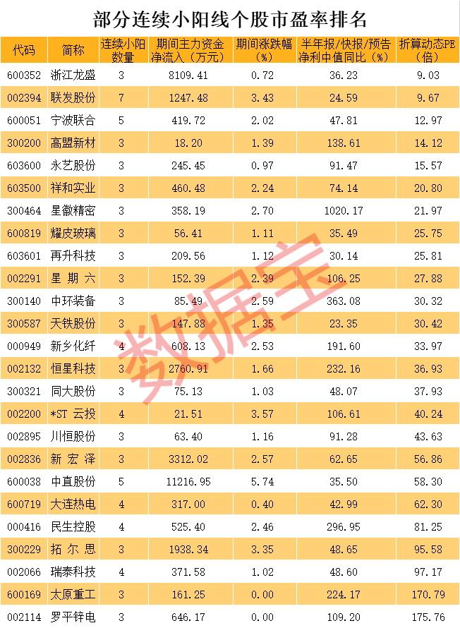 以连续小阳线期间主力资金流向来看,部分个股获得了较多的主力资金青睐。其中,成都银行9连阳期间主力净流入资金超过1.58亿元居首;兴业银行3连阳期间主力资金净流入1.34亿元位居次席,中航沈飞吸金1.25亿元位居第三位,中直股份吸金1.12亿元位居第三位。