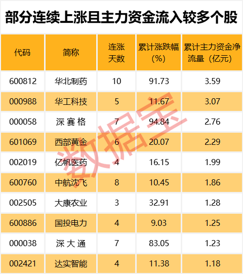 值得注意的是,262只连续上涨个股中,12只个股期间主力资金累计净流入超过亿元。其中,累计资金流入最多的为华北制药,主力资金累计流入3.59亿元。