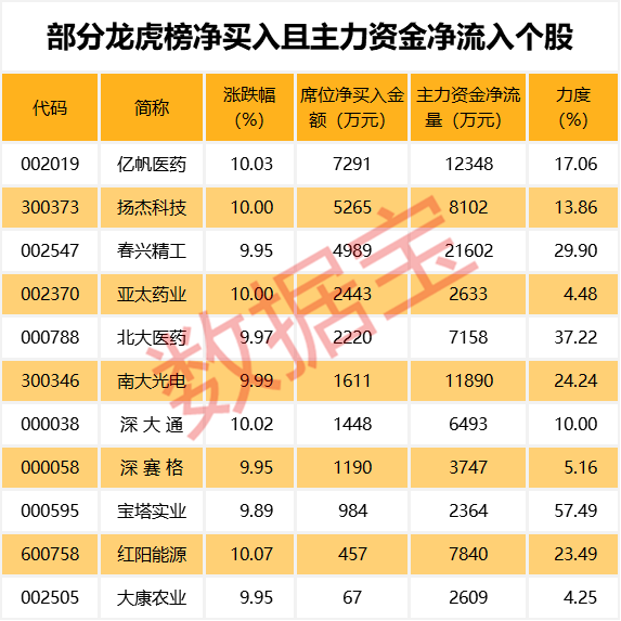 从盘口资金流向来看,主力资金净流入超千万且龙虎榜净买入个股共有11只,其中春兴精工、亿帆医药、南大光电等个股资金净流入金额最大。净流入力度最大的个股有宝塔实业、北大医药、春兴精工,净流入力度分别为57.49%、37.22%、29.9%。
